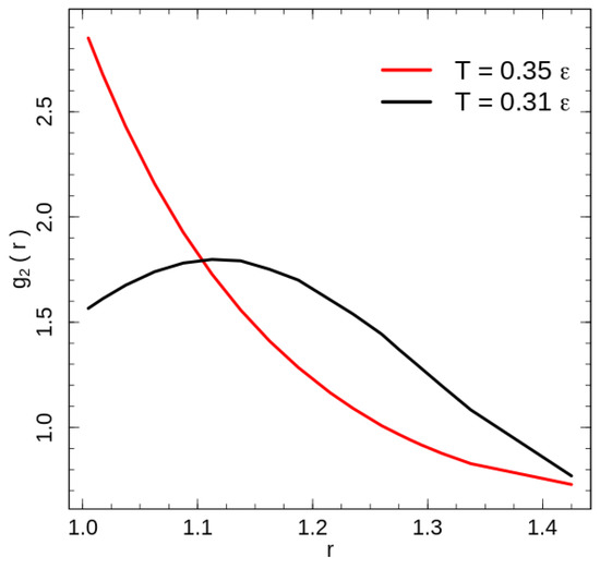 The radial distribution function calculated for two temperatures: (black line) and (red line).