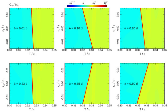 Heat capacity maps calculated for temperatures around the phase transition. The corresponding interaction ranges are shown on the maps.