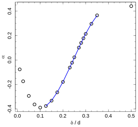 where the slope reflects a ‘shift rate’ created by the additional interactions, and is the phase transition temperature in absence of contact energy contribution (For the fitting we considered as a free fitting parameter, but the fitted values were the same for all interaction ranges, and equal to the transition temperature of the system with purely hard-sphere interaction). Since positive values of correspond to the square-well attraction, positive values of correspond to the increase in the transition temperature by attractive interaction, and the indicates an ordering assistance of the repulsive interaction. The fitted ‘shift-rates’ are presented in Figure 6.