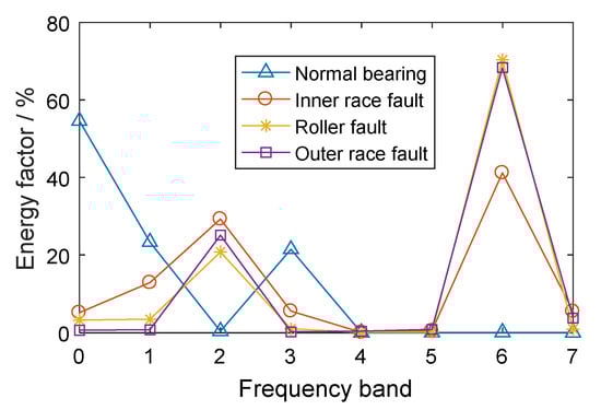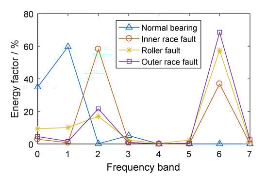 It can be seen, from Figure 2, that there were differences in the energy distributions of bearings in different conditions. For the normal bearing, the signal energy was mainly concentrated in the low frequency band (especially in the 0th frequency bands) and the energy factor in the high frequency band was relatively small. The energy of the low frequency band for the normal bearing mainly came from the even vibration noise generated by the rotation of the bearing. The frequency band energy distributions of the bearings with different kinds of faults were similar, mainly concentrated in the 2nd and 6th frequency bands, especially the 6th frequency band of the high frequency part, which was caused by the fact that localized defect impact can cause resonance at high natural frequencies of the axle-box bearing system. Therefore, for the fault bearings, the 6th frequency band, with high energy factor, contained abundant fault feature information. The normal bearing energy in the 6th frequency band was small, such that the normal bearing and the fault bearings had significant feature differences in this frequency band.