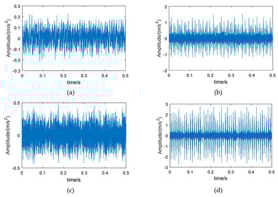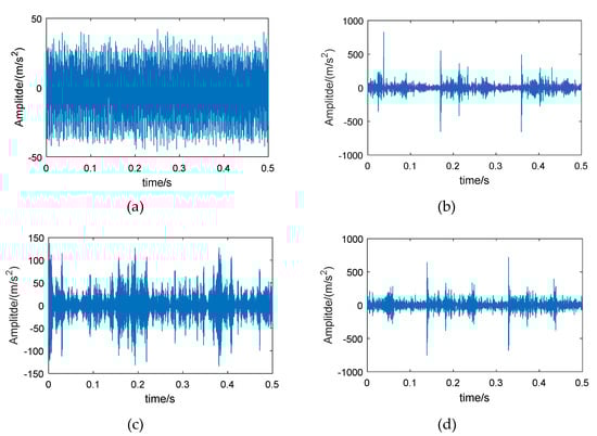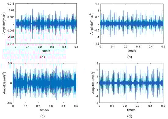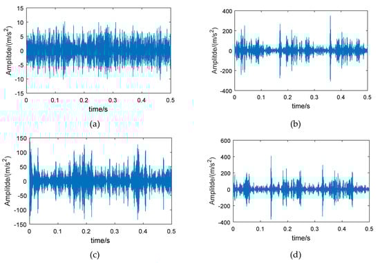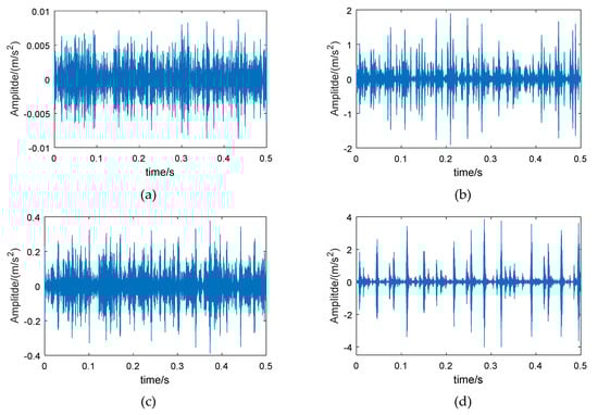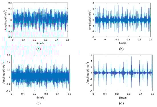 Vibration signals of different bearings (from the wheelset-bearing system test bench): (a) normal bearings, bearings with (b) inner race fault, (c) roller fault, and (d) outer race fault.