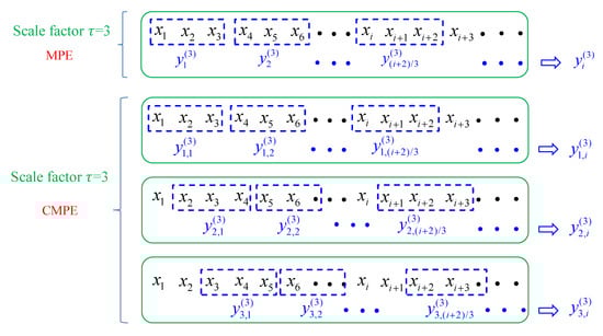 CMPE improves the coarse-grained procedure by using multiple coarse-grained time-series at one scale factor. By improving Equation (13), CMPE obtains new coarse-grained series at a scale factor of , where the kth coarse-grained series can be obtained by: