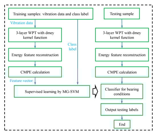 The flowchart of bearing fault diagnosis based on a wavelet packet transform, energy feature reconstruction, composite multiscale permutation entropy and classification method of medium Gaussian support vector machine (WPT-EFR-CMPE + MG-SVM).