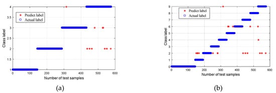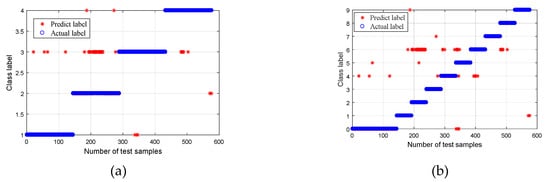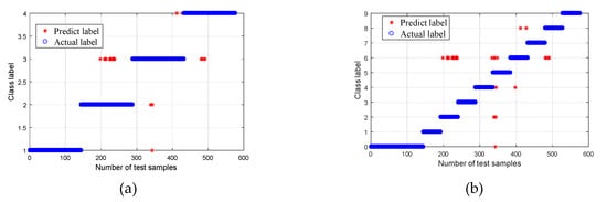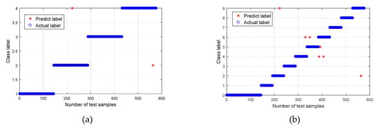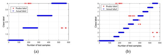 Classification results using proposed method: (a) Group I, with four bearing conditions; and (b) Group II, with 10 bearing conditions.