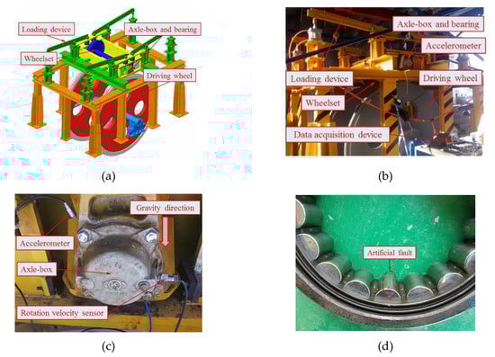 The wheelset-bearing system test bench: (a) schematic diagram of the test bench, (b) photo of overall test bench, (c) photo of axle-box and accelerometer, and (d) artificial fault on a roller.
