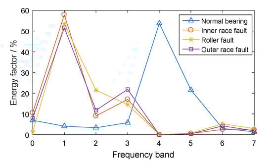 The CWRU-BDC (Case Western Reserve University Bearing Data Center) data set is taken as an analysis example (this data set will be introduced in more detail in Section 5.1). Based on the experimental vibration signals in different conditions, including a normal bearing, a bearing with an inner race fault, a bearing with a roller fault, and a bearing with an outer race fault, three-layer WPT was performed on the vibration signals. Each signal was decomposed into eight parts in the frequency domain and the energy factors were calculated according to Equation (6). The energy distributions of the different bearings are shown in Figure 2.