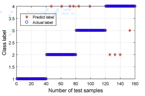 For signals of different bearing condition types, the training and testing data set samples were collated. For each bearing fault type, the number of training samples was 100 and the number of testing samples was 40. For mode classification, the normal bearing was marked with label 1, the inner race fault was marked with label 2, the roller fault was marked with label 3, and the outer race fault was marked with label 4. The classification results are shown in Figure 24 and Table 5. The classification accuracy of the normal bearings and fault bearings were 100%, and the recognition rate was high. There were four inner race faults incorrectly identified as outer race faults, two roller faults incorrectly identified as outer race faults, three outer race faults incorrectly identified as inner race faults, and one outer race fault incorrectly identified as a roller fault. The overall recognition rate was 93.75%.
