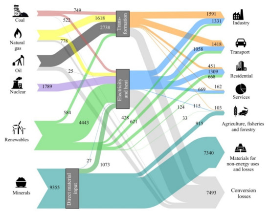 Energy sources can be very diluted, such as with solar or geothermal, or be highly concentrated, such as with fossil fuels or nuclear energy. Highly concentrated energy sources have complex problems. For example, fossil fuels have adverse effects on climate change, whereas nuclear energy processing requires treatment of dangerous waste and entails the risk of accidents. To counter these issues, a global agreement exists that nations must promote renewable energies. However, the efficient and intelligent use of energy requires equipment, which, in turn, requires raw materials. Today, some of these raw materials are already scarce in nature, posing important supply risk problems (i.e., critical). Renewable energy technologies and electric mobility are now more mineral intensive than current energy sources. Thus, to what extent can the world become dependent on these materials? Do we need sufficient critical raw materials to support an energy transition to combat climate change? For example, new efficient solar photovoltaic cells may contain copper, silver, silicon, cadmium, tellurium, indium, selenium, or gallium. Most wind turbines need permanent magnets with high contents of neodymium, praseodymium, and dysprosium with boron and iron or, alternatively, cobalt and samarium. They also require copper and other structural materials such as steel and aluminum. Biomass, on the other hand, requires phosphates, potassium, and other microelements such as zinc, magnesium, cobalt, and manganese. In Valero et al. [16], we published a list of elements that might be at risk because of supply shortages for the development of green technologies. We also estimated the mineral capital assessed in exergy terms that would be necessary to maintain the global temperate below 2 °C, as proposed in the Paris Agreement of the 21st Conference of the Parties [17]. Among the many long-term international projections, we took the 2DS scenario from the International Energy Agency [18] that accepts a global temperature increase of 2 °C with a probability of 50%, reaching the GHG peak in 2020 and decreasing gradually until reaching the neutrality of the energy sector in 2100. This scenario contemplates the growth of the population and the adoption of economic, energy, and environmental policies leading to an increased share of efficiency, renewable energies, and electric mobility according to the prefixed objectives. The result for such an expected energy transition is illustrated in Figure 1 as a Sankey diagram. To retain the same units, we evaluated each metal demand in terms of its exergy replacement cost rather than in tonnage. However, tonnage was also assessed as explained in Valero et al. [19].