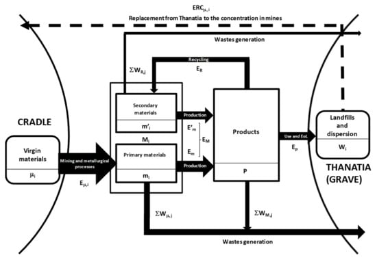 Let us now analyze the recycling process, , which implies disassembling, dismantling, dissolving, and smelting ; isolating and refining each component ; and then spending a given exergy cost ER (kW·h). This is a reverse metallurgical/industrial process that unavoidably produces waste ∑WR,j.