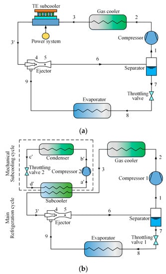 - Liu, X.; Fu, R.; Wang, Z.; Lin, L.; Sun, Z.; Li, X. Thermodynamic analysis of transcritical CO2 refrigeration cycle integrated with thermoelectric subcooler and ejector. Energy Convers. Manag. 2019, 188, 354–365. [Google Scholar] [CrossRef]