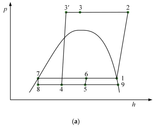 The critical impact of the refrigeration and air-conditioning industry on ozone depletion and global warming has developed into an alarming issue, which is mainly attributed to the wide application of synthetic refrigerants. Thus, interest in natural refrigerants have been increasing rapidly. In this situation, CO2 is regarded to be an extremely promising refrigerant thanks to its zero ODP, negligible GWP, non-toxicity, non-flammability, and superior transport and thermophysical properties [,,]. However, a transcritical cycle mode is generally required at common refrigeration conditions because of the lower critical temperature of CO2, which leads to great throttling loss []. Consequently, the coefficient of performance (COP) of a transcritical CO2 system is often lower than that of a system using synthetic refrigerants. Furthermore, the COP drops rapidly as environmental temperature rises, which further limits the application of the cycle in warm and hot regions []. In order to improve system performance, some strategies have been adopted such as employing an expansion device to replace the throttling valve and installing a subcooling system behind the gas cooler.