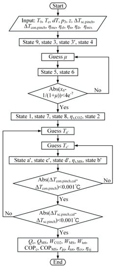 According to the above model, the simulation code was written in MATLAB to study system performance at various working conditions, where the properties of refrigerants and air were obtained using REFPROP 9.1 []. Figure 3 presents the flowchart of computational procedure, which is explained in detail as follows: