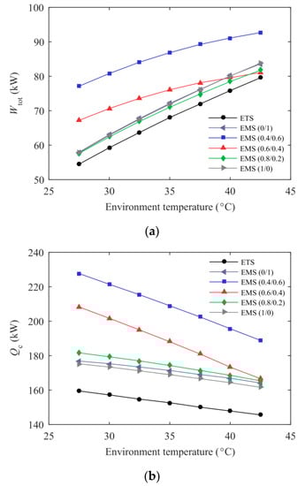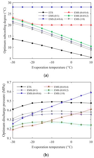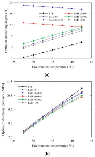 Optimum operating condition of the ETS and the EMS cycles’ variation with environmental temperature: (a) optimum subcooling degree; (b) optimum discharge pressure.