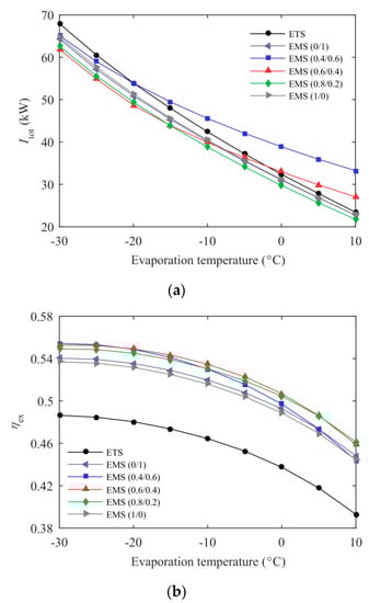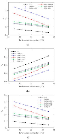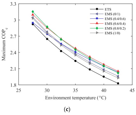 The variations of optimum subcooling degree and discharge pressure with environmental temperature for the ETS and the EMS cycles at Te = –5 °C are described in Figure 5. The EMS cycles using mixed refrigerants showed a higher optimum subcooling degree than those using pure refrigerants. The EMS (0.4/0.6) cycle had a larger temperature glide in the subcooler and the corresponding higher optimum subcooling degree, followed by the EMS (0.6/0.4) cycle. The optimum subcooling degree of the EMS (0.8/0.2) cycle exhibited a similar trend to that of the EMS cycle using pure R1234ze(Z) or R32 due to the small temperature glide of R32/R1234ze(Z) (0.8/0.2). The thermoelectric subcooler showed high performance at low-temperature lift and, thus, its optimum subcooling degree was minimal in the range studied. It can be seen from Figure 5b that the optimum discharge pressure increased with the environmental temperature. The optimum discharge pressure of the EMS cycles at both 0.8/0.2 and 0.6/0.4 were lower than that of the ETS cycle, especially for the higher environmental temperatures.