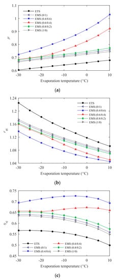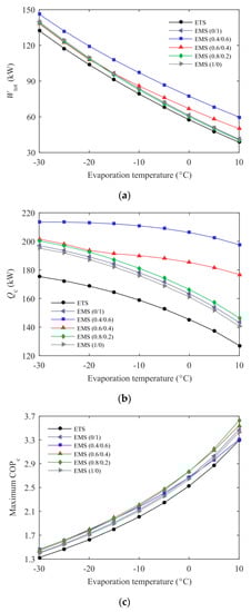 Figure 4 shows COPc variations of the ETS and the EMS cycles with subcooling degree and discharge pressure at T0 = 35 °C and Te = −5 °C when R32/R1234ze(Z) (0.6/0.4) was used as the MS refrigerant. COPc first increased rapidly and then decreased gradually with the discharge pressure, and the effect of the subcooling degree on COPc also showed a similar pattern, which is consistent with the results in previous studies and which have been fully explained [,]. Furthermore, a maximize COPc can be obtained with a simultaneous optimization of subcooling degree and discharge pressure. The corresponding optimum subcooling degree and discharge pressure constitute the optimum operating condition. For the purpose of more reasonably comparing the systems, the following analyses were carried out based on the optimum operating condition.