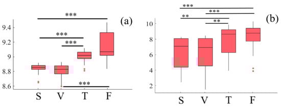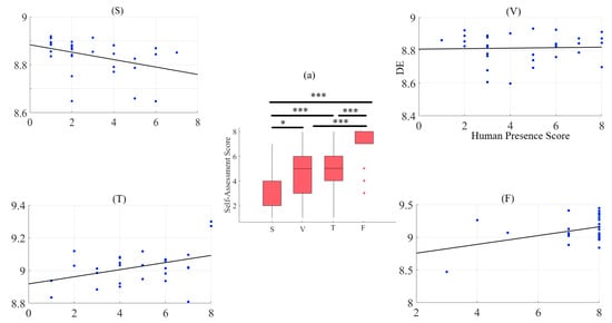 (a) Descriptive statistics of post hoc comparison with Shaffer’s modified sequentially rejective Bonferroni correction of self-assessment of participants to induced sense of human presence in different media settings. Asterisks mark media with significant differences (*: p < 0.05, **: p < 0.01, ***: p < 0.001). Subplots (S), (V), (T), and (F): Pearson correlation between variational information of left-hemispheric frontal brain activity of human subjects and their self-assessed responses to induced feelings of human presence by speaker (S), video-chat (V), Telenoid (T), and face-to-face (F).