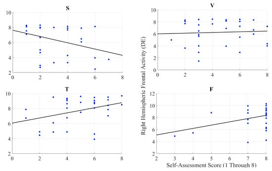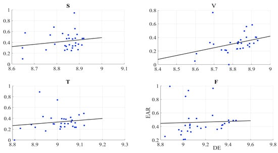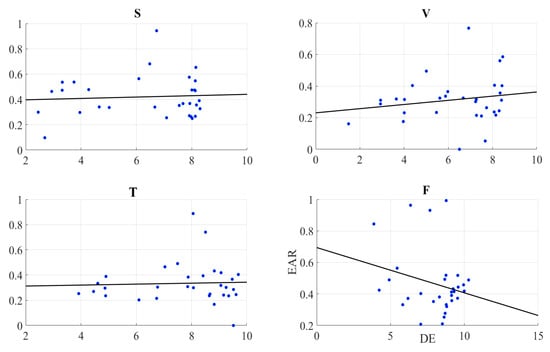 Pearson correlation between left-hemispheric frontal brain activity (i.e., DE) of participants and eye aversion ratio (EAR) of their gazing data: speaker (S), video-chat (V), Telenoid (T), and face-to-face (F).
