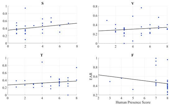Pearson correlation between self-assessed responses of participants to feelings of presence and eye aversion ratio (EAR) of their gazing data: speaker (S), video-chat (V), Telenoid (T), and face-to-face (F).