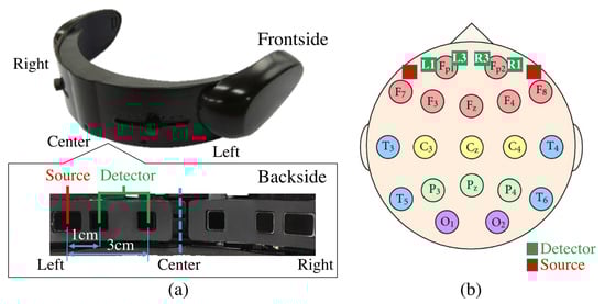 (a) Near infrared spectroscopy (NIRS) device in present study. Bottom subplot on left shows arrangement of source-detector of four channels of this device. Distances between short (i.e., 1.0 cm) and long (i.e., 3.0 cm) source and detector of left and right channels are shown. (b) Arrangement of 10–20 International Standard System: In this figure, relative locations of channels of NIRS device in our study (i.e., L1, L3, R1, and R3) are depicted in red (i.e., sources) and green (i.e., detectors) squares. L1, R1, L3, and R3 are channels with short (i.e., 1.0 cm) and long (i.e., 3.0 cm) source-detector distances.