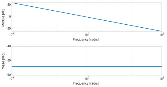 As it is possible to observe in Figure 1, the behaviour of the fractional-order integrator is different from that of the integer order one. Evaluating module and phase of Equation (5), it follows that the module is equal to dB/dec, while the phase is constant in all the frequency domain and equal to . In the example, with , the module has a slope of dB/dec, whereas the phase is constant to . Therefore, selecting only one parameter, it is possible to obtain different dynamics. This property can be useful both in control and in system modelling.