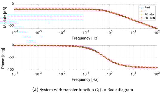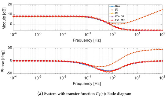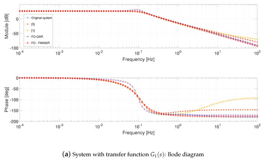 The transfer function represents an improper system. In the case of the implicit model [5], a zero of could not be taken into account in the reduction. In fact, in the vector S (see Section 3.2), the first and last position elements must be poles. Therefore, one zero will remain out of the approximation. The effect of the zero will start from the fourth decade, see Figure 3a, with the visible increase of the module and phase in the frequency approximation. On the contrary, the FO-GA approach is able to reduce the original system using a reduced improper transfer function with six parameters. In particular, the two parameters and bring to a reduced system in an improper form. The same consideration can be done for the FO-FMINS because, with , and neglecting , the reduced system is also in an improper form. The best approximation is provided by the balanced approach [1] that provides a simple and effective first order reduced model.