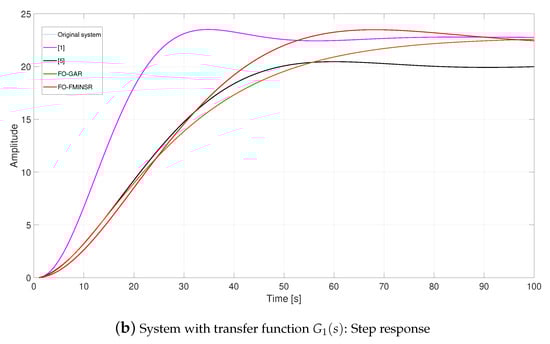 Considering the system, the frequency responses of the reduced models, see Figure 2a, show a better approximation in the cases of the two methodologies FO-GA and FO-FMINS. The approximating transfer functions are in the form of Equation (12c) for the FO-GA approach and in the form Equation (12d) for the FO-FMINS. Independently from the optimization algorithm and from the chosen approximating function, the fractional order models reveal themselves to be quite versatile in the approximation.