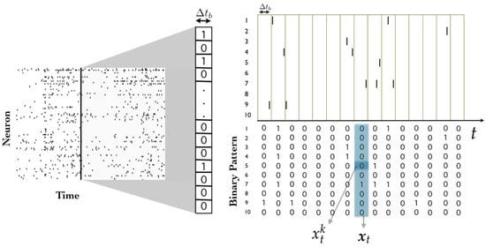 Consider a network of N spiking neurons, where time has been binned (i.e., discretized) in such a way that each neuron can exhibit no more than one action potential within one time bin . Action potentials, or “spikes”, are “all-or-none” events, and hence, spike data can be encoded using sequences of zeros and ones. A spiking state is denoted by , and corresponds to the event in which the k-th neuron spikes during the t-th time bin, while implies that it remains silent.