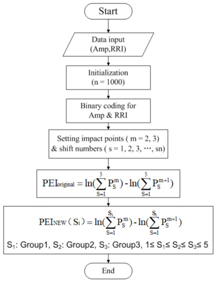 As in [16], where the possibility of using PEIoriginal to assess autonomic function by counting the percussion numbers between the two fluctuating time series of Amp and RRI with a fixed shift number of 1 to 5 for every group, the parameters in this study were set at m = 2 and n = 1000 (Figure 1).