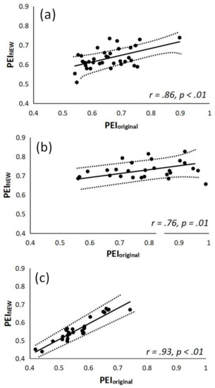 3.1.3. Correlation between PEINEW and PEIorginal for the Three Groups