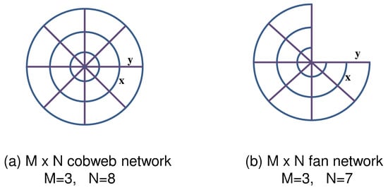 An cobweb network with and (a). An fan network with and (b). The weights x and y are assigned to the bonds in circular and radial directions, respectively. The cobweb network can be considered as a cylinder, where all sites on the one boundary are connected to an external common site, which is denoted by 0, while the fan network can be considered as a plane rectangular lattice, where all sites on one of four boundaries are connected to an external common site.
