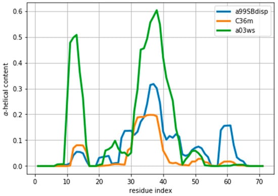 Amount of helical content in the ACTR trajectories simulated using different force fields. The a99SBdisp is taken as the target ensemble and the C36m and a03ws as the simulated trajectories to reweight.