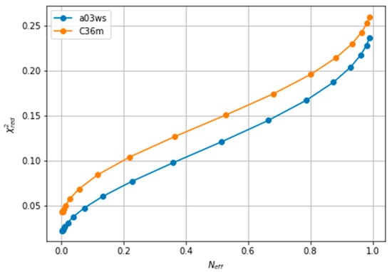 Evolution of with the effective sample size (Neff), showing the lack of an L-shaped curve. The a99SBdisp is taken as the target ensemble and the C36m and a03ws as the simulated trajectories to reweight.