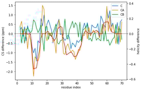 CS difference between the target CS and the a03ws CS for the three atoms used (C, CA, and CB) compared to the difference in helicity for these two ensembles (in red). Although for many residues the difference lies below the error of the predictor, for some regions it does not. Besides, the helicity is correlated with the CA and the CB CS difference.