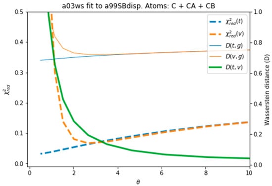 After each of the fittings, we compared the average values with Equation (2) and the distribution of values between the reweighted and the target distribution with the Wasserstein distance, as implemented in the Python package SciPy []. As each pair of reweighted and target CS distributions produces a Wasserstein distance value, thus we used the mean of all these m values as a measure of the similarity between two sets of distributions.