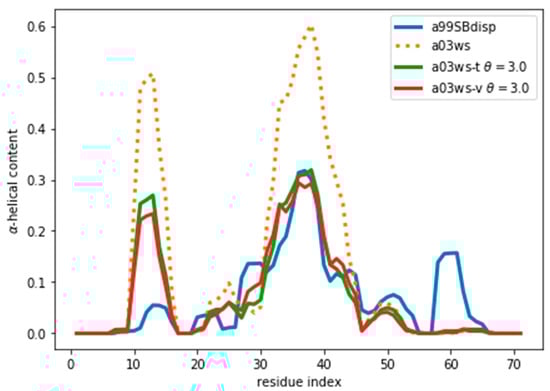 Once an optimal value for θ has been determined, other properties of the ensemble can be calculated. As an example, here we calculate the α-helical content and plot it in Figure 5 and Figure S9. We stress that the reweighting improves the fit, but does not lead to a perfect agreement. There are several sources for the disagreement. The major source of the disagreement is the fact that the predictor (PPM software) has an error in the prediction with respect to the target value (Sparta+ software). Even for the same ensemble of configurations predicted and target CS differ, thus leading to a disagreement between secondary structure content, as is discussed below. Further, although the two are tightly related, there is not a one-to-one relationship between the secondary structure and the CS values. Also, the reweighted ensemble may not contain structures with the optimal α-helical content. For example, the a03ws ensemble contains a negligible amount of α-helical structures around residue number 60, therefore, even after the reweighting, the helicity of this region cannot increase and remains too low. Finally, as long as the experimental data does not uniquely specify the target distribution, procedures such as this will always be affected by the choice of a reference (prior) distribution and will thus not give the exact target distribution.