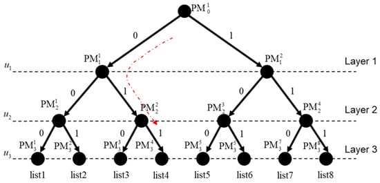 It can be seen that the decoding result of the current codeword is related to all previous decoding results in SC decoding, that is, the previous error bit will affect the decoding result of the current bit. In order to solve this problem, the SCL algorithm proposed in [] expresses all possibilities of SC decoding in the form of a binary tree, as shown in Figure 1. The red dotted line represents a path of list4, and the two branches of each node represent the two possibilities of the node with “1” or “0”. For example, the information bit corresponds to the two paths of the first layer in Figure 1. and represent the reliability of the two paths, respectively.