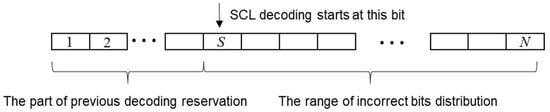 It can be seen that the burst error bits of the SC decoding are mostly within three bits, and the probability of only one burst error bit is the largest. Therefore, if the decoding result does not pass the CRC, there is a great possibility caused by a burst error bit of information. We can select an appropriate information bit , which is located in front of all the error bits. When re-decoding, the decoded bits before the -th bit are reserved, and the information bits after the -th bit are decoded by using the increasing decoding algorithm. A schematic diagram of the process is shown in Figure 3.