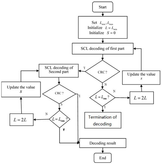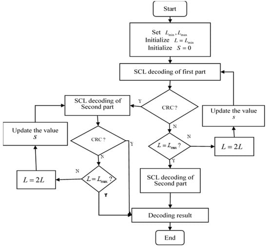 The flow chart of the SAD-SCL decoding algorithm is shown in Figure 4. Let denote the decoding output value of SAD-SCL. The decoding algorithm can be divided into the following decoding steps: