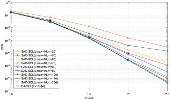 Li et al. put forward the adaptive SCL (AD-SCL) decoding algorithm [], which reduces the complexity of SCL in the case of specified performance. The difference between AD-SCL and CA-SCL lies in that AD-SCL sets the minimum path value and the maximum path value, while SCL starts to decode from . If there is an error decoding result after CRC, re-decoding starts by increasing until the decoding passes the CRC or equals to .