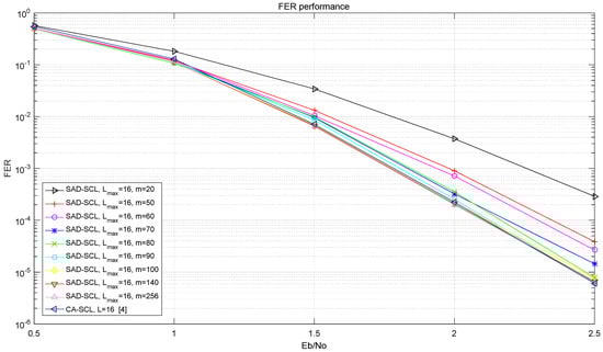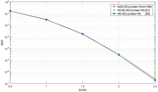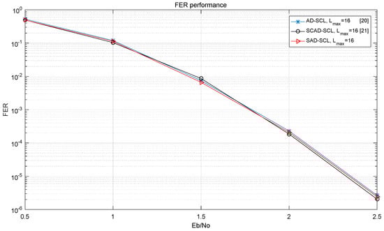 Figure 11 and Figure 12 show the BER and FER performance curves of the SAD-SCL (m = 140), SCAD-SCL, AD-SCL algorithms when = 16 under AWGN channel and BPSK modulation. It is observed that there is little performance loss from the SAD-SCL algorithm compared to the other two adaptive algorithms.