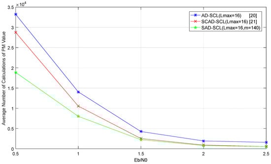 When the code length is 1024 and the code rate is 0.5 respectively, the average number of calculations of value for AD-SCL, SCAD-SCL, SAD-SCL with = 16 is shown in Figure 9. It is observed that the complexity of the three adaptive algorithms declines with the increase of SNR.