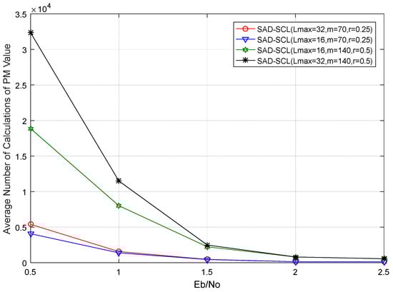 Figure 10 shows the comparison curves of the average number of calculations of value for SAD-SCL algorithm under different code rates and . It can be seen that the smaller the code rate and are, the less the average update times of SAD-SCL are.