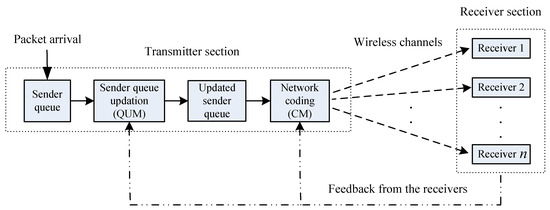 In Figure 1, we outline our model for the broadcasting transmission scenario we will be studying in this paper. As mentioned in Section 1.1, the modules QUM and CM process the data packets at the transmitter side, which are then sent to the receivers through wireless channels. The roles of these two modules will be discussed in detail in Section 3.