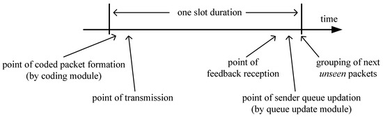 Relative timing of encoding, transmission, feedback reception, and sender queue updation points within a time slot.