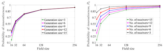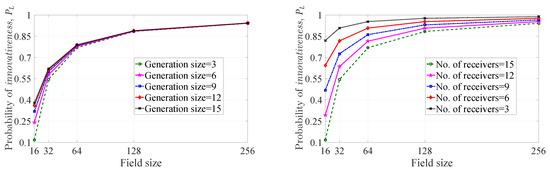 As rDWS encoding is not throughput optimal, there is no minimum field size requirement actually. However, one can notice that if the field size is less than the number of receivers, there may be some situations where the probability of getting an innovative combination is zero (i.e., no proper choice is available in the pool of choices, depending on the finite field, that can make an innovative combination). Keeping this in mind, for our analysis, we only consider the extension fields of GF(2) of which the sizes are greater than or equal to the number of receivers. As an example, in Figure 6 (Section 4.2.1), the maximum number of receivers under consideration is 15. The nearest extension field of GF(2) of which the size is greater than or equal to 15 is GF(). Hence, we plot the graphs in Figure 6 with respect to field size, starting from .