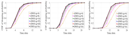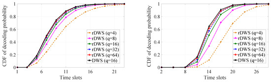 For a fixed rDWS case (or for the DWS case), the cumulative probability curve for single receiver grows faster than the curve for all receiver in Figure 10. This is evident as decoding by all receivers is equivalent to decoding by the last receiver in the list. In both of the subfigures, the performance of the rDWS scheme with GF() is very close to the performance of the DWS technique.