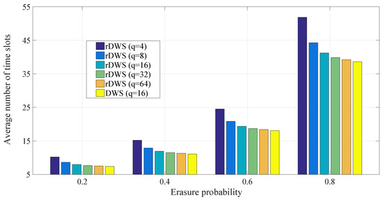For each erasure probability consideration, the average number of slots for rDWS tends towards the DWS case as we move from GF() to GF(). One can argue similarly as in Section 5.1.1 and conclude that DWS refers to the limiting behavior of the rDWS cases with increasing field size. In our evaluation, the performance of the rDWS scheme with GF() is sufficiently close to the DWS scenario. One more point to notice from Figure 9 is: the plots (all five plots for rDWS and the DWS plot) get sparse from each other as we increase the erasure probability. This is also due to the non-uniform and rapid increase of slot-wise erasure heterogeneity with erasure probability.