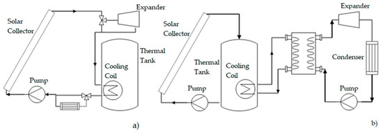 Currently, there are a number of domestic-sized solar ORC systems [12,13,14,15,16]; their main operation characteristics are shown in Table 1. However, none of them has a configuration using direct vapor generation with evacuated tube collectors. These configurations generally use an indirect heat exchanger between the solar heating system and the ORC system (see Figure 1). The aim is to use the solar system only for pre-heating the working fluid, and to later evaporate the fluid with a conventional heat source under controlled conditions.