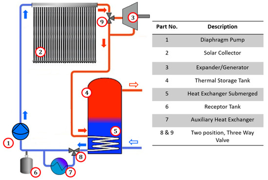 A cogeneration system is proposed for integration into solar water heating systems [22], as shown in Figure 2 and Table 2 describes in detail the main system components. It comprises a solar collector (evaporator) (2) which is interconnected to a two-position, three-way valve (9). In one position, the valve (9) allows the working fluid to flow towards the condenser (5), and in the other valve position the working fluid is directed towards an expansion device (3). The working fluid that comes out of the expansion device (3) is directed towards the condenser (5). The condenser (5) is a heat exchanger submerged inside the hot water tank (4).