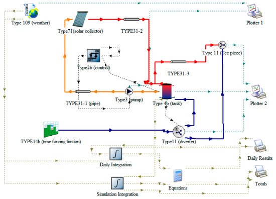 The SDHWS was analyzed in TRNSYS, describing a conventional evacuated tube collector solar hot water system. These simulations allow the prediction of the performance of a system by analyzing performance under dynamic conditions, allowing a proper system sizing. Figure 3 shows the scheme used for the study of the TRNSYS simulation.